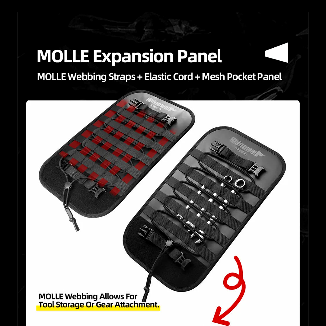 - MOLLE Webbings Straps + Elastic Cord + Mesh Pocket Panel